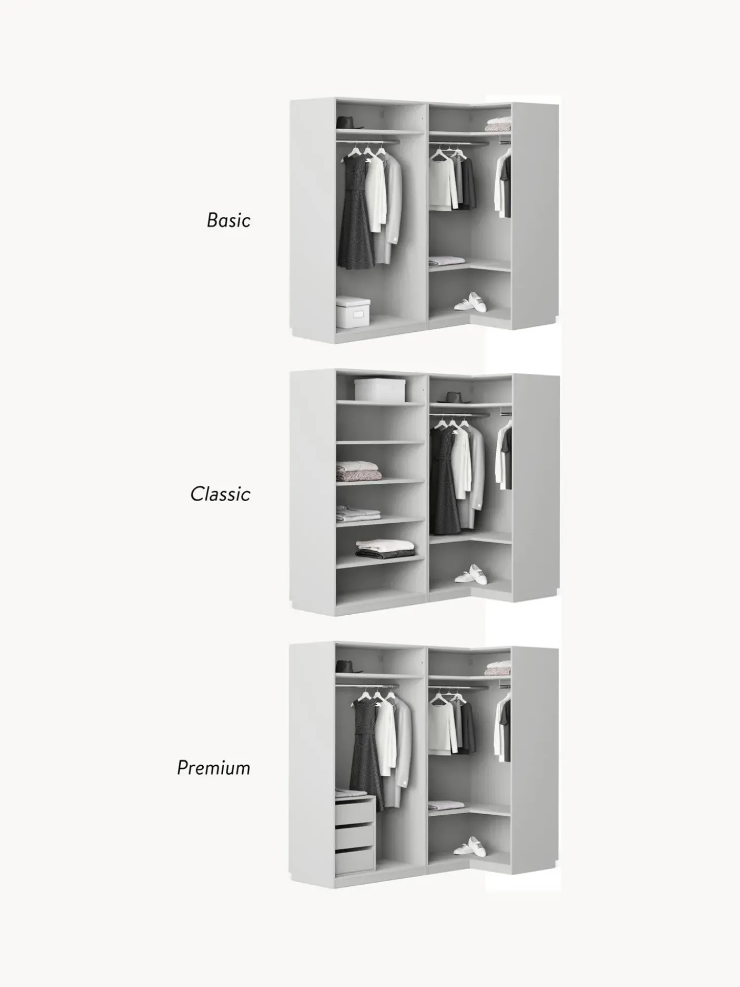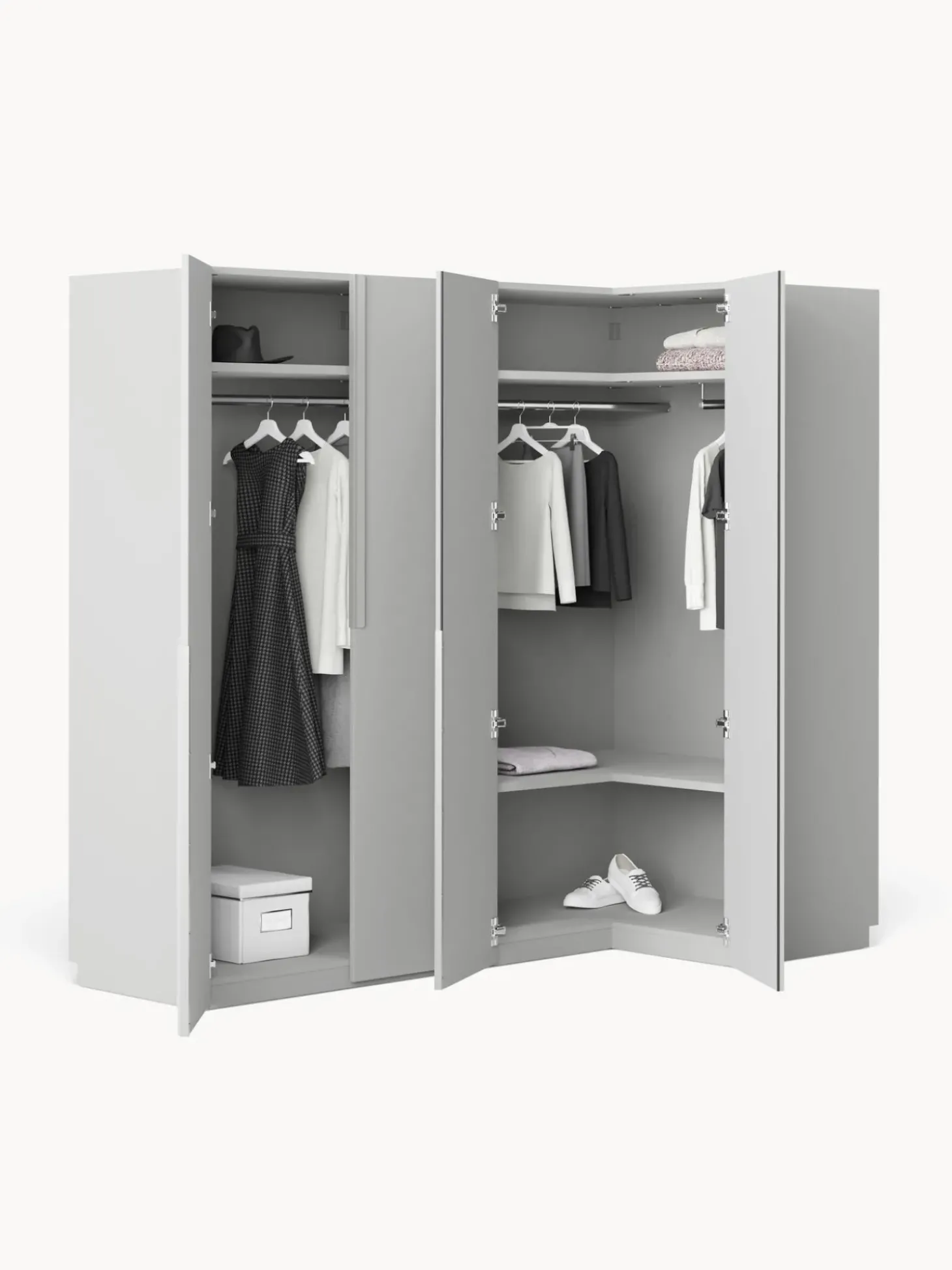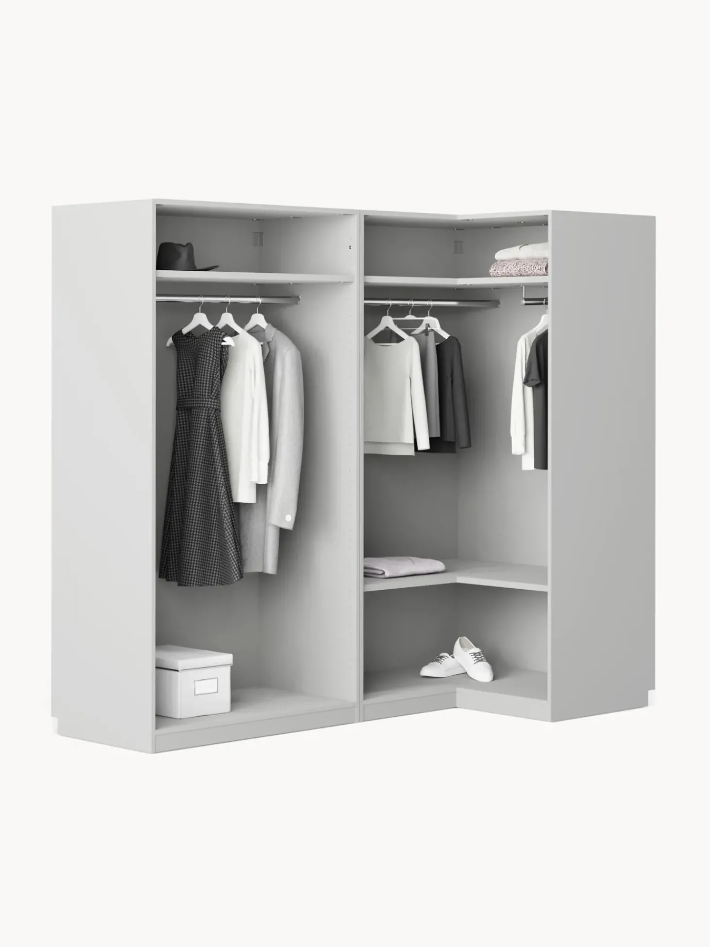 U00Bforden Y Modernidad Con Un Toque De Diseu00F1O No Hay Problema! Nuestro Armario Modular Leon En Exclusiva En Westwing Colletion Tiene Una Superficie Mate Y El Diseu00F1O De Sus Tiradores Le Da Ese Algo Especial! Definitivamente El Armario Se Adapta A Todos Los Dormitorios, Y Trae Consigo La Sensaci De Un Diseu00F1O Especial. Practico: El Armario Estu00E1 Disponible Tres Variantes Interiores (Basic, Classic, Premium) Y En Diferentes Alturas Y Anchuras.Nn- Armario Modular Compuesto Por 1 Mu00F3Dulo Esquinero Y 1 Mu00F3Dulo Con Interior Basicn- El Mu00F3Dulo Esquinero Incluye 2 Barras Para Ropa, 2 Estantesn- El Mu00F3Dulo Con Interior Basic Incluye 1 Barra Para Ropa, 1 Estanten- Puertas Con Sistema Soft-Close (Cierre Suave)N- Con Barras Y Estantes De Ropa Regulables En Alturan- La Construcci Vertical Y Los Elementos Del Armario Premontados Reducen El Trabajo De Montajen- Hecho En Europannel Diseu00F1O Se Mezcla Con La Funcionalidad. Diseu00F1A Tu Armario Leon A Tu Gusto Combinando Mu00F3Dulos Individuales O Ampliando El Armario Leon Ya Existente. Todos Los Mu00F3Dulos Leon Se Pueden Encontrar En Nuestra Gama.Nntu Armario Debe Ser Tan U00Fanico Como Tu Estilo! Nuestro Armario Leon Te Ofrece Tres Interiores Diferentes Para Que Puedeas Elegir Cual Te Satisficace Tus Necesidades Mejor:Nninterior Basic:N- Nu00Famero De Barras: 1N- Nu00Famero De Estantes: 1N- Nu00Famero De Cajones: 0Nninterior Classic:N- Nu00Famero De Barras: 1N- Nu00Famero De Estantes: 3N- Nu00Famero De Cajones: 0Nninterior Premium:N- Nu00Famero De Barras: 1N- Nu00Famero De Estantes: 1N- Nu00Famero De Cajones: 3