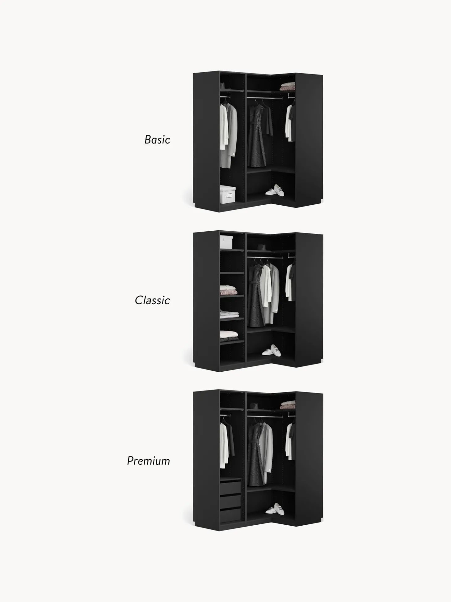 U00Danico, Diverso Y Modular. Nuestra Serie De Armarios Simone, En Exclusiva En Westwing Colletion, Estu00E1 Diseu00F1Ada Pensado En Todos Los Detalles! Segu00Fan Tus Necesidades, El Armario Estu00E1 Disponible Tres Variantes Interiores (Basic, Classic, Premium), En Diferentes Alturas Y Anchuras Y Con Puertas Correderas O Batientes. El Armario Con Su Aspecto Elegante Y Glamuroso No Solo Impresiona Por Su Pru00E1Ctico Interior, Sino Tambiu00E9N Por El Inusual Aspecto De Lu00E1Minas En Las Puertas. Un Verdadero Punto Culminante Del Diseu00F1O En Cada Dormitorio!Nn- Armario Modular Compuesto Por 1 Mu00F3Dulo Esquinero Y 1 Mu00F3Dulo Con Interior Basicn- El Mu00F3Dulo Esquinero Incluye 2 Barras Para Ropa, 2 Estantesn- El Mu00F3Dulo Con Interior Basic Incluye 1 Barra Para Ropa, 1 Estanten- Puertas Con Sistema Soft-Close (Cierre Suave)N- Con Barras Y Estantes De Ropa Regulables En Alturan- La Construcci Vertical Y Los Elementos Del Armario Premontados Reducen El Trabajo De Montajen- Hecho En Europannel Diseu00F1O Se Mezcla Con La Funcionalidad. Diseu00F1A Tu Armario Simone A Tu Gusto Combinando Mu00F3Dulos Individuales O Ampliando El Armario Simone Ya Existente. Todos Los Mu00F3Dulos Simone Se Pueden Encontrar En Nuestra Gama.Nntu Armario Debe Ser Tan U00Fanico Como Tu Estilo! Nuestro Armario Simone Te Ofrece Tres Interiores Diferentes Para Que Puedeas Elegir Cual Te Satisficace Tus Necesidades Mejor:Nninterior Basic:N- Nu00Famero De Barras: 1N- Nu00Famero De Estantes: 1N- Nu00Famero De Cajones: 0Nninterior Classic:N- Nu00Famero De Barras: 0N- Nu00Famero De Estantes: 5N- Nu00Famero De Cajones: 0Nninterior Premium:N- Nu00Famero De Barras: 1N- Nu00Famero De Estantes: 1N- Nu00Famero De Cajones: 3